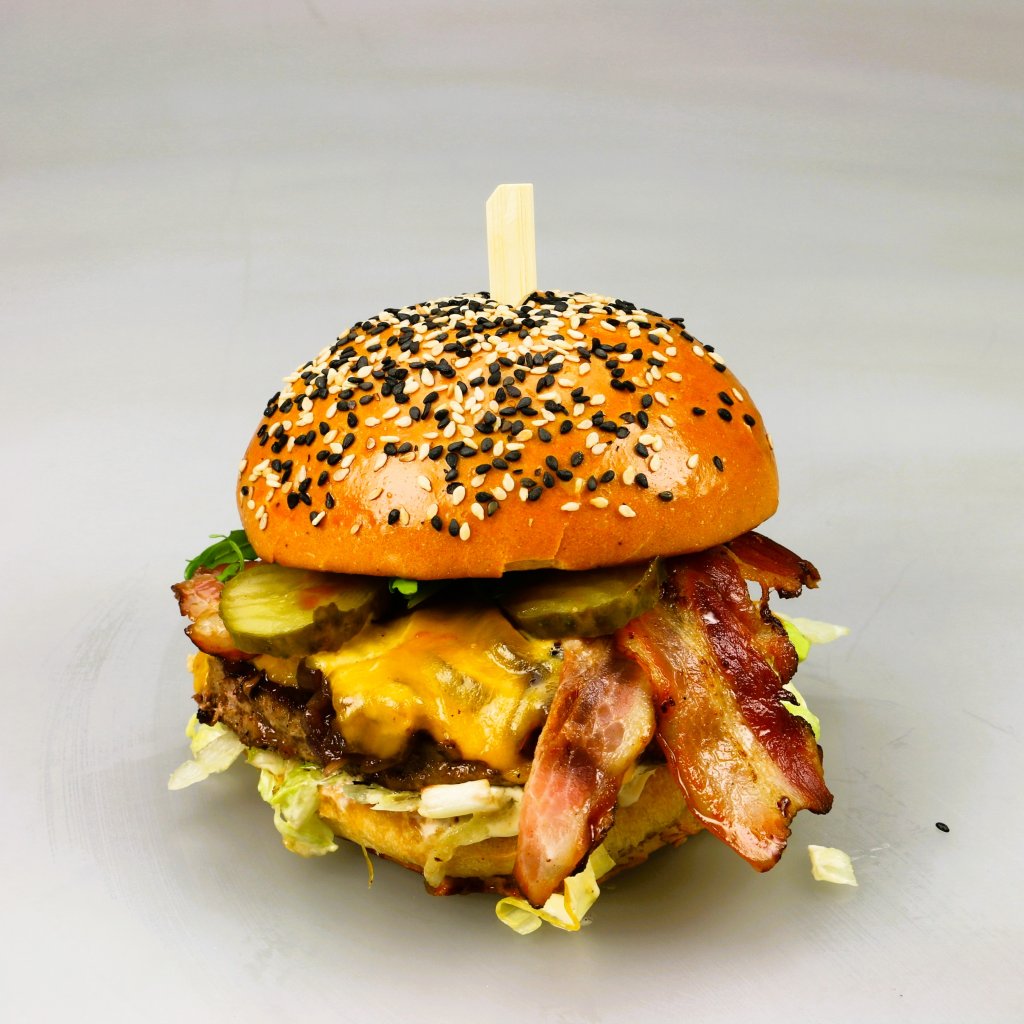 Naše houska, mleté vyzrálé hovězí maso, karamelizovaná cibule, čedar, slanina, okurka, BBQ omáčka, majonéza, salát