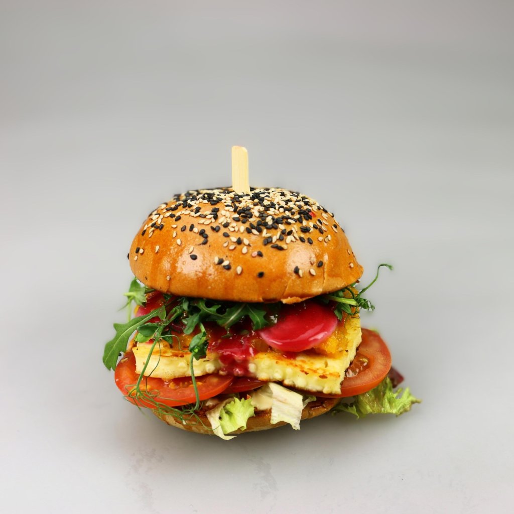 Naše houska, grilovaný sýr, dýňové čatní, malinová omáčka, majonéza, rajče, salát