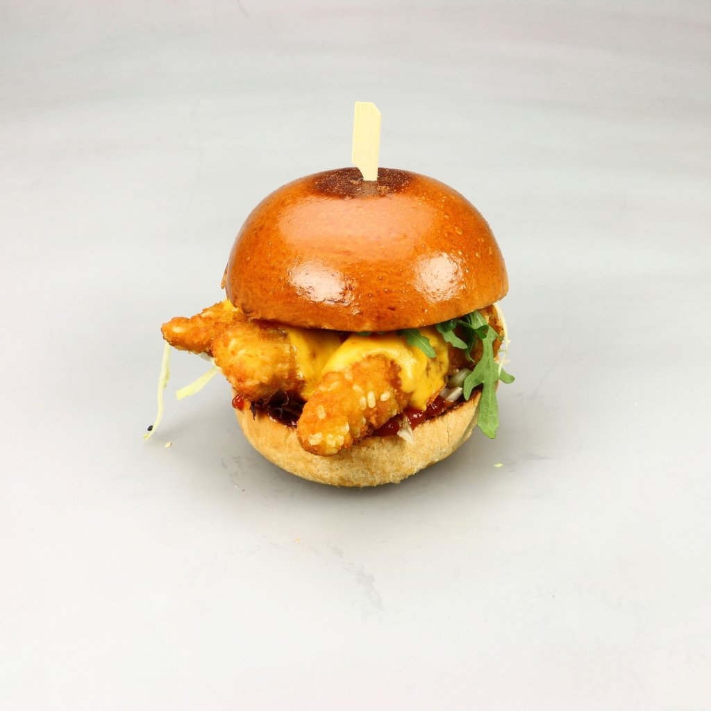 Naše houska, smažené kuřecí stripsy, čedar, kečup, salát