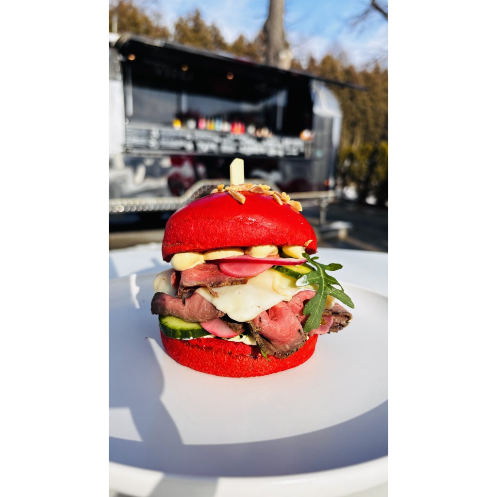 naše valentýnská houska, hovězí roastbeef, sýr excelent gold, truffle mayo, nakládaná zelenina, salátek